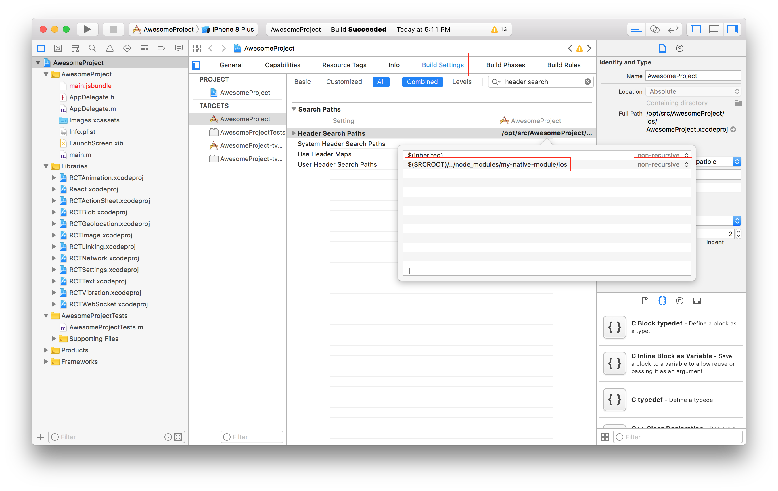 If you do need to call it from native, then we need to know the library's headers. To achieve that you have to go to your project's file, select Build Settings and search for Header Search Paths. There you should include the path to your library. (This documentation used to recommend using recursive, but this is no longer recommended, as it can cause subtle build failures, especially with CocoaPods.)